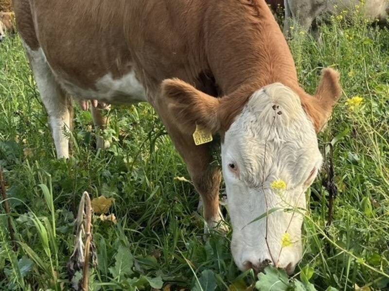 Unsere Mutterkuhherde (Fleckvieh und Aubrac) halten wir in ganzjähriger Weidehaltung. Die Rinder fressen Futter von unseren Wiesen und Äckern. Soviel frisches Gras, wie es das Wetter zulässt, dann eigenes Heu und Silage aus Klee-Luzerne-Gras oder Zwischenfruchtaufwuchs. Die Rinder sind damit ein wichtiger Teil unseres Betriebs, sie verwerten Gras und Zwischenfrüchte und düngen unsere Flächen.