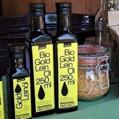 Goldleinöl wird aus dem hellen Leinsamen hergestellt. Das Öl schmeckt deutlich milder als das Leinöl aus dunklem Leinsamen. Der Omega-3 Gehalt des dunklen Leinöls und von Goldleinöl unterscheiden sich kaum und liegen zwischen 55% und 59%.